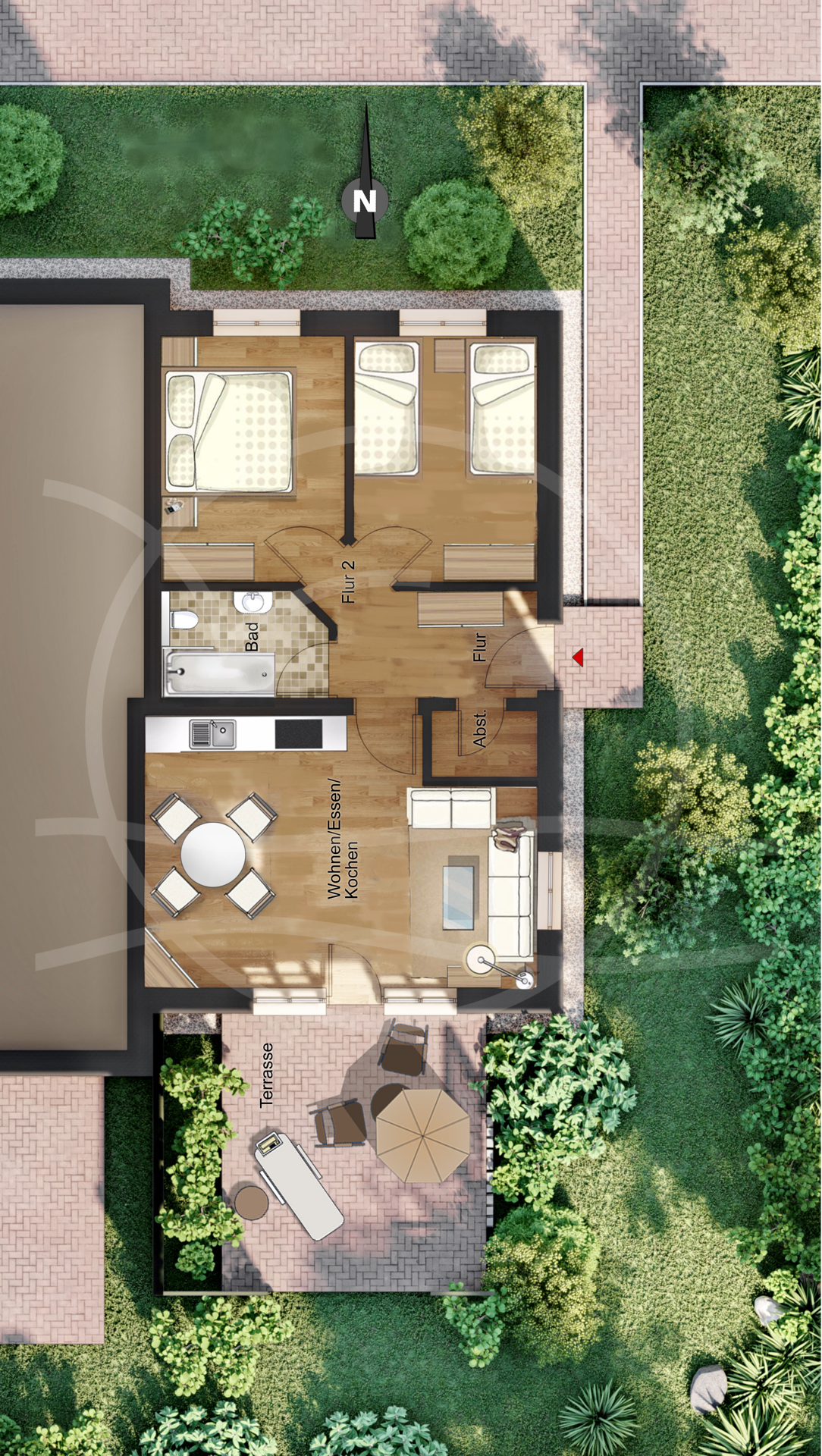 Helle Erdgeschosswohnung mit 2 Schlafzimmern, sonniger Terrasse und eigenem Garten.