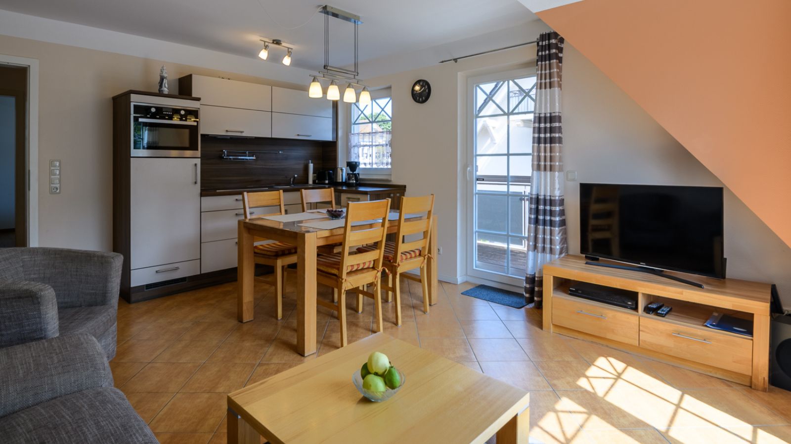 Die beiden stilvollen Villen „Carpe Diem“ und „Sola Bona“ wurden im Jahr 2009 erbaut und stehen für Individualität und Qualität. Auf dem großzügigen Grundstück befinden sich insgesamt 18 Wohneinheiten, die Villa „Sola Bona“ umfasst davon sieben. Die zum Verkauf stehende Wohnung liegt im ersten Dachgeschoss und überzeugt durch einen offenen Wohn-, Ess- und Küchenbereich mit geräumiger Einbauküche. Der Essbereich bietet bequem Platz für vier Personen. Vom Wohnzimmer aus sind gleich zwei große Balkone auf der Ost- und Südseite zugänglich, die viel Licht und Sonne versprechen. Zwei Schlafzimmer – eines mit Doppelbett, das andere mit zwei Einzelbetten – bieten ausreichend Raum für Familie oder Gäste. Das Badezimmer verfügt über ein Fenster, eine ebenerdige Dusche sowie eine Waschmaschine. Abgerundet wird das Angebot durch einen Pkw-Stellplatz und einen eigenen Schuppen. Die Wohnung wird derzeit erfolgreich als Ferienwohnung vermietet und eignet sich ideal als Kapitalanlage oder zur Eigennutzung.